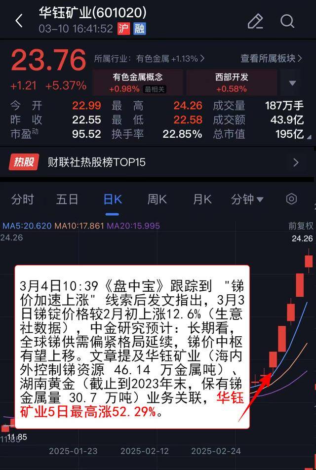 3月4日10:39《盘中宝》 跟踪到 "锑价加速上涨" 线索后发文指出,3月3日锑锭价格较2月初上涨12.6%(生意社数据),中金研究预计:长期看,全球锑供需偏紧格局延续,锑价中枢有望上移。文章提及华钰矿业(海内外控制锑资源 46.14 万金属吨),华钰矿业5日最高涨52.29%。
