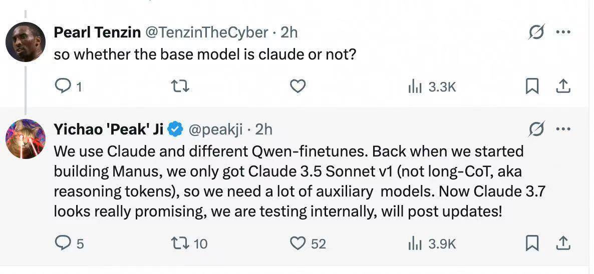 3月10日,Manus创始人季逸超在社交平台透露,Manus产品使用了不同的基于阿里千问大模型(Qwen)的微调模型。Manus是由创业公司Monica 发布的首款AI Agent产品,最近在社交媒体火爆出圈。