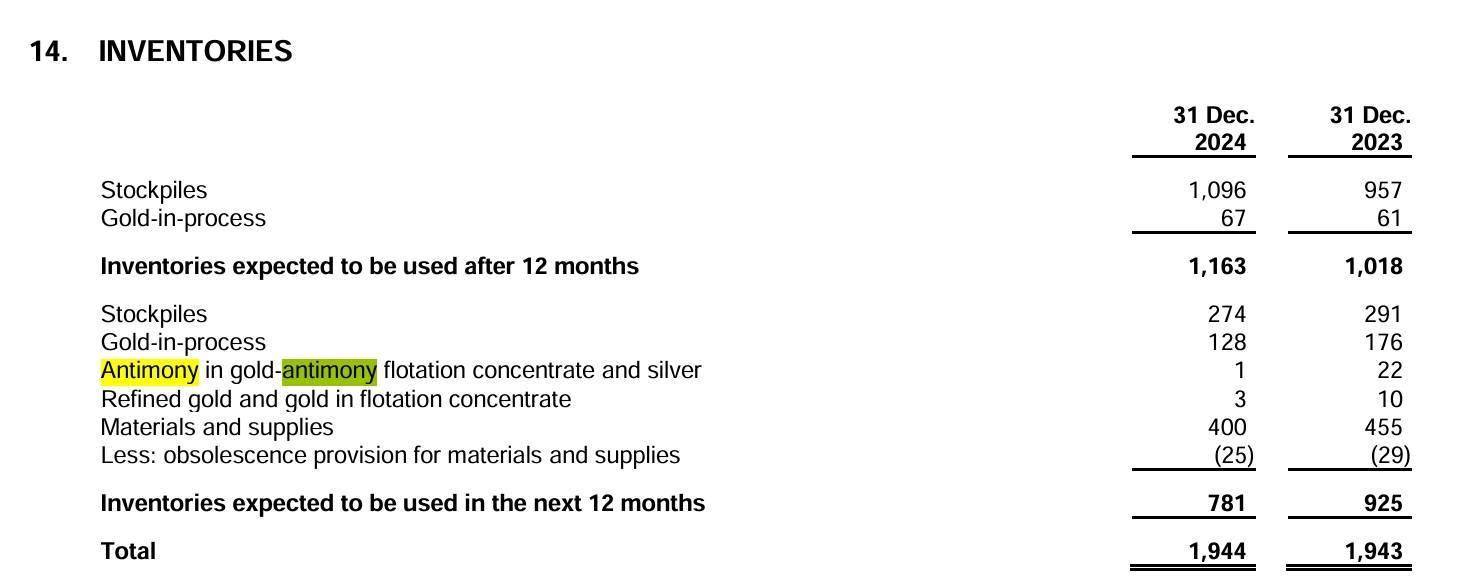 另一方面,2024年底极地黄金锑存货价值约100万美元,较2023年底2200万美元的存货价值大幅下降,表现出2024年极地黄金已大幅消化锑库存。