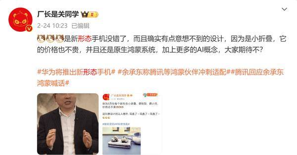 在余承东的近期视频中,这位华为常务董事透露,华为即将在3月发布一款颠覆性的新形态智能手机,这款手机专为原生鸿蒙系统量身打造,在硬件、软件及生态系统层面均取得了突破性成就。