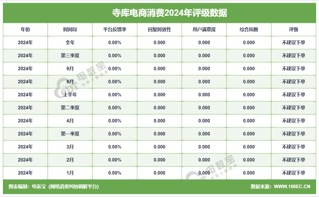 据旗下电商大数据库“电数宝”监测数据显示,2024年“寺库”共获得11次消费评级,其中11次都为“不建议下单”评级,2024年整体消费评级为“不建议下单”评级 。