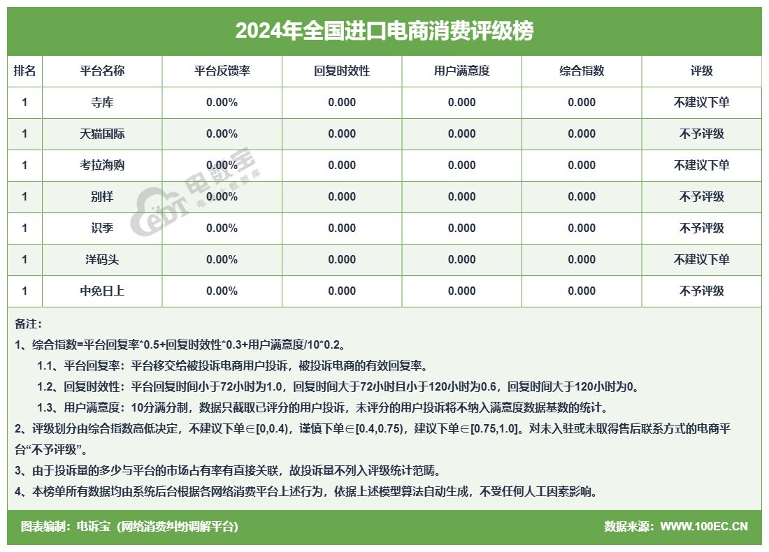 在“2024年进口跨境电商消费评级榜”中,洋码头、天猫国际、别样、识季、中免日上获“不予评级”;寺库、考拉海购获“不建议下单”评级。