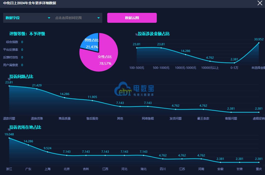 据“电数宝”显示,2024年全年,“中免日上”的问题类型主要集中于退款问题、退换货难、商品质量、售后服务、网络售假、发货问题、霸王条款、客服问题、虚假促销;“电诉宝”受理投诉用户聚集地区为浙江省、广东省、上海市、北京市、吉林省、江西省、河北省、湖北省、四川省;其中,女性用户投诉比例为78.57%、男性用户投诉比例为21.43%;用户投诉“中免日上”投诉金额分布于100-500元、500-1000元、1000-5000元、10000元以上、0-5万元区间。
