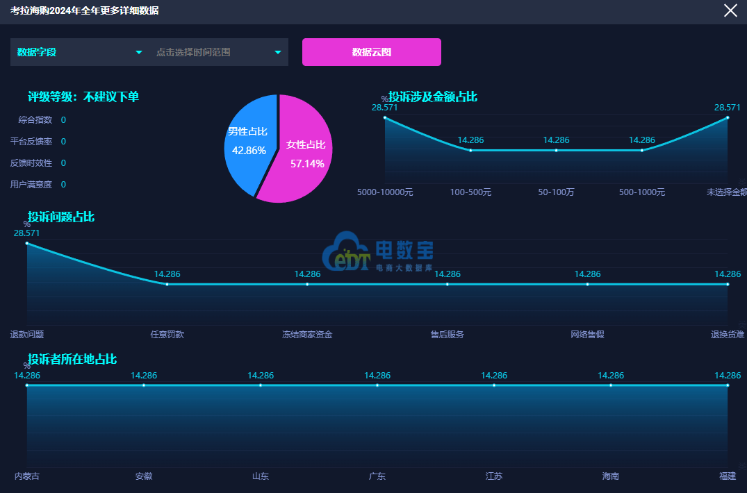 据“电数宝”显示,2024年全年,“考拉海购”的问题类型主要集中于退款问题、任意罚款、冻结商家资金、售后服务、网络售假、退换货难;“电诉宝”受理投诉用户聚集地区为广东省、江苏省、上海市、北京市、安徽省、山东省、浙江省、湖南省、福建省、辽宁省、重庆市;其中,女性用户投诉比例为57.14%,男性用户投诉比例为42.86%;用户投诉“识季”投诉金额分布于5000-10000元、100-500元、50-100万元、500-1000元区间。