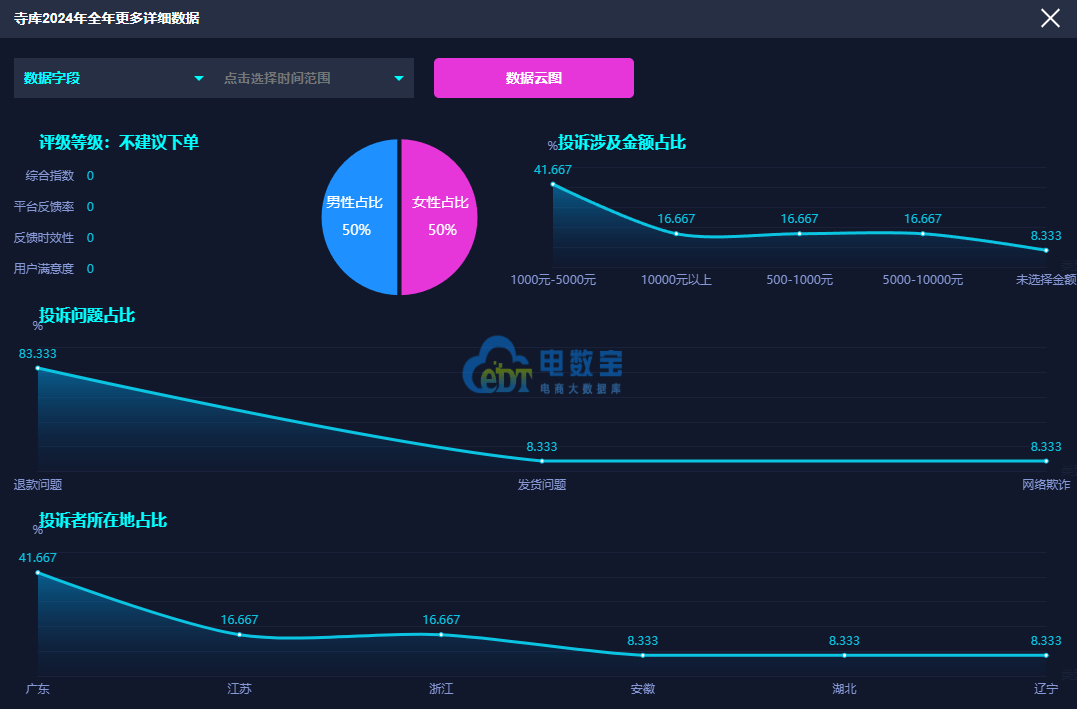 2024年,用户投诉“寺库”的问题类型主要集中于退款问题、发货问题、网络欺诈;“电诉宝”受理投诉用户聚集地区为广东省、江苏省、浙江省、安徽省、湖北省、辽宁省;其中,女性、男性用户投诉比例都为50.00%;用户投诉“寺库”投诉金额分布于1000-5000元、10000元以上、500-1000元、5000-10000元区间。
