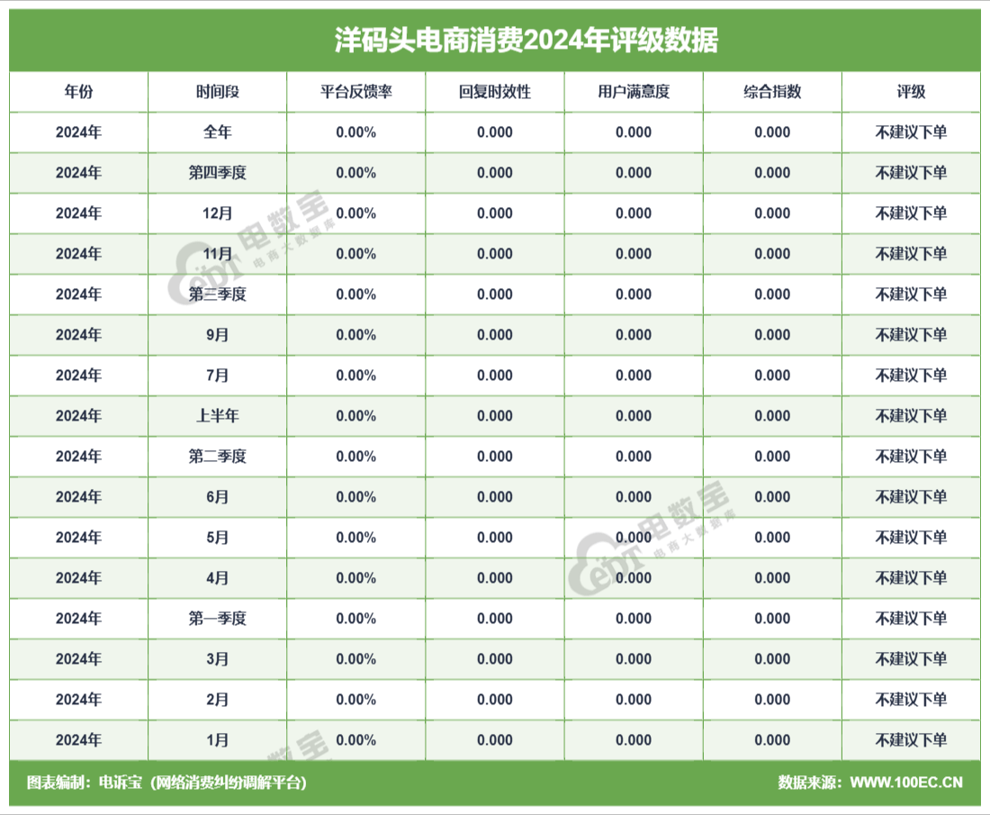 据“电数宝”监测数据显示,2024年“洋码头”共获得16次消费评级,均为“不建议下单”评级,2024年整体消费评级为“不建议下单”评级。