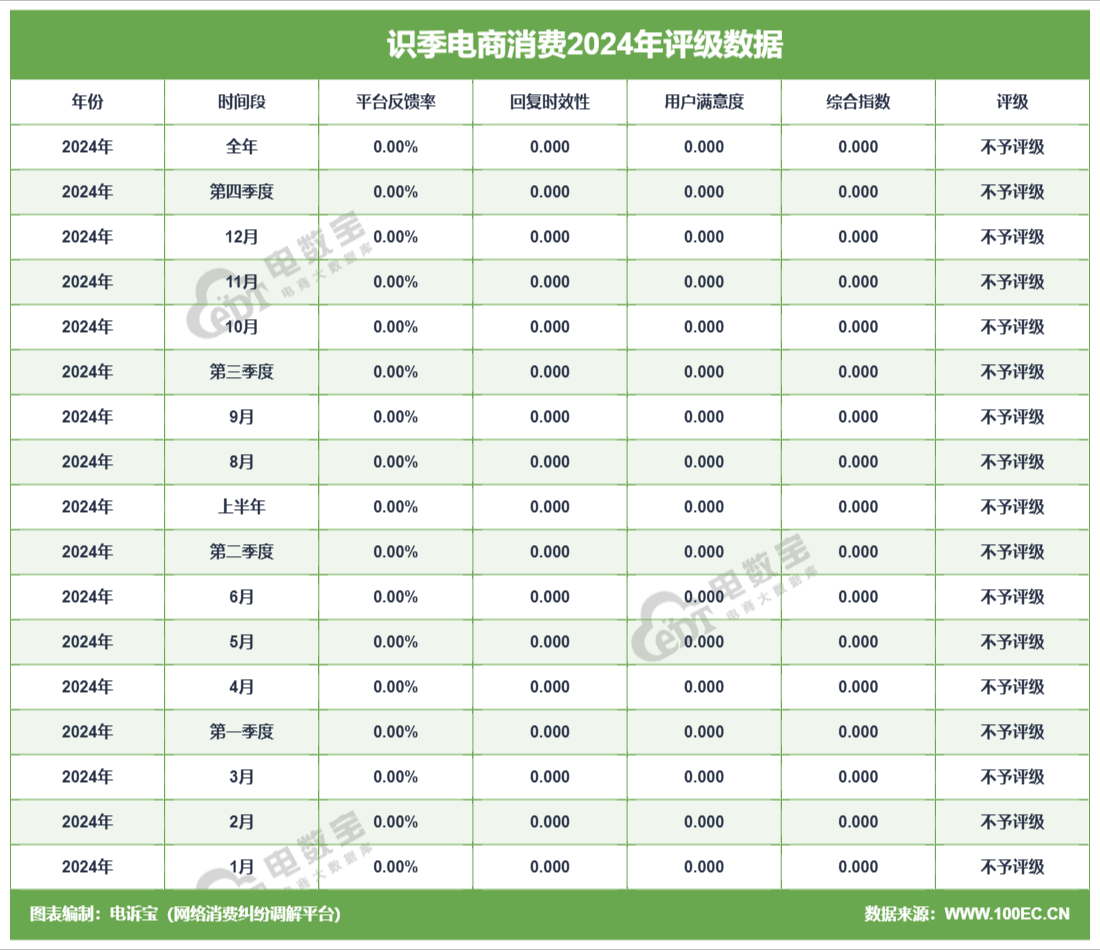 据“电数宝”监测数据显示,2024年“识季”共获得17次消费评级,均为“不予评级”,2024年整体消费评级为“不予评级”。