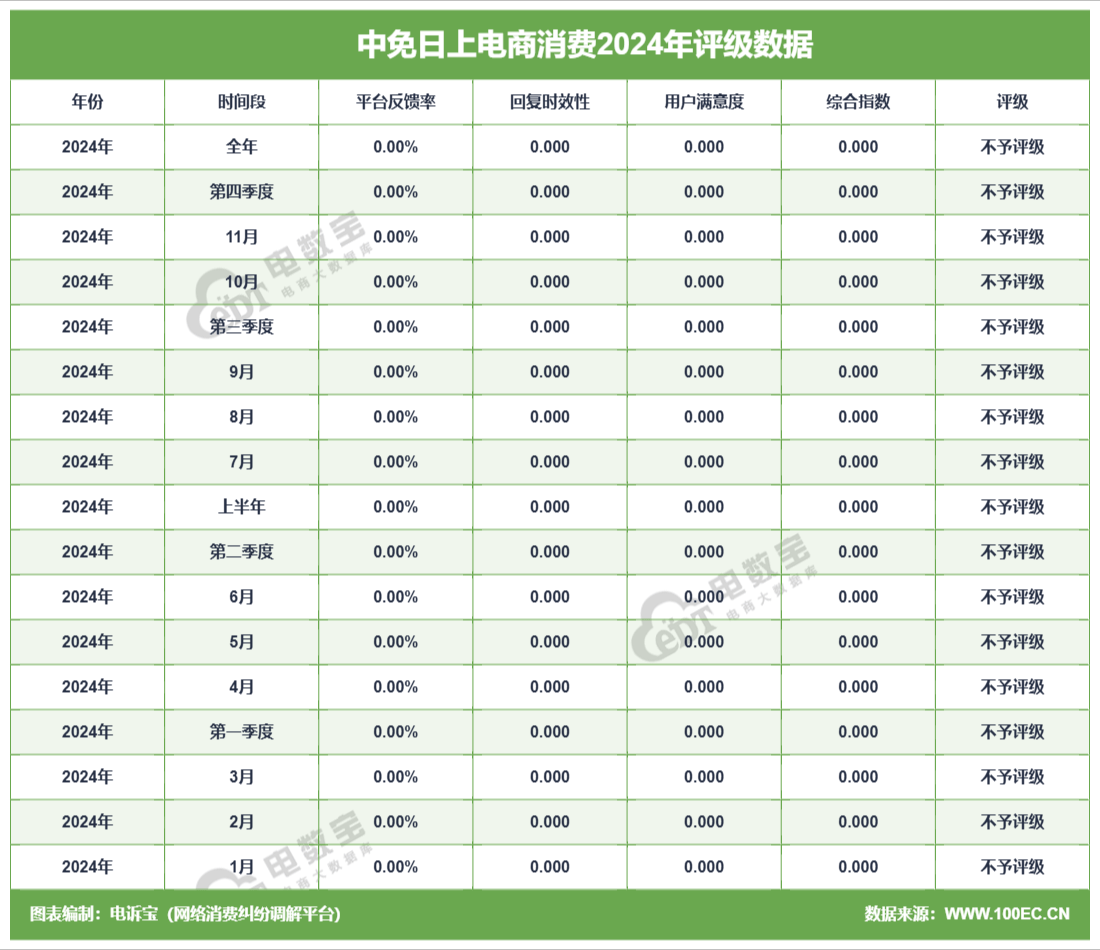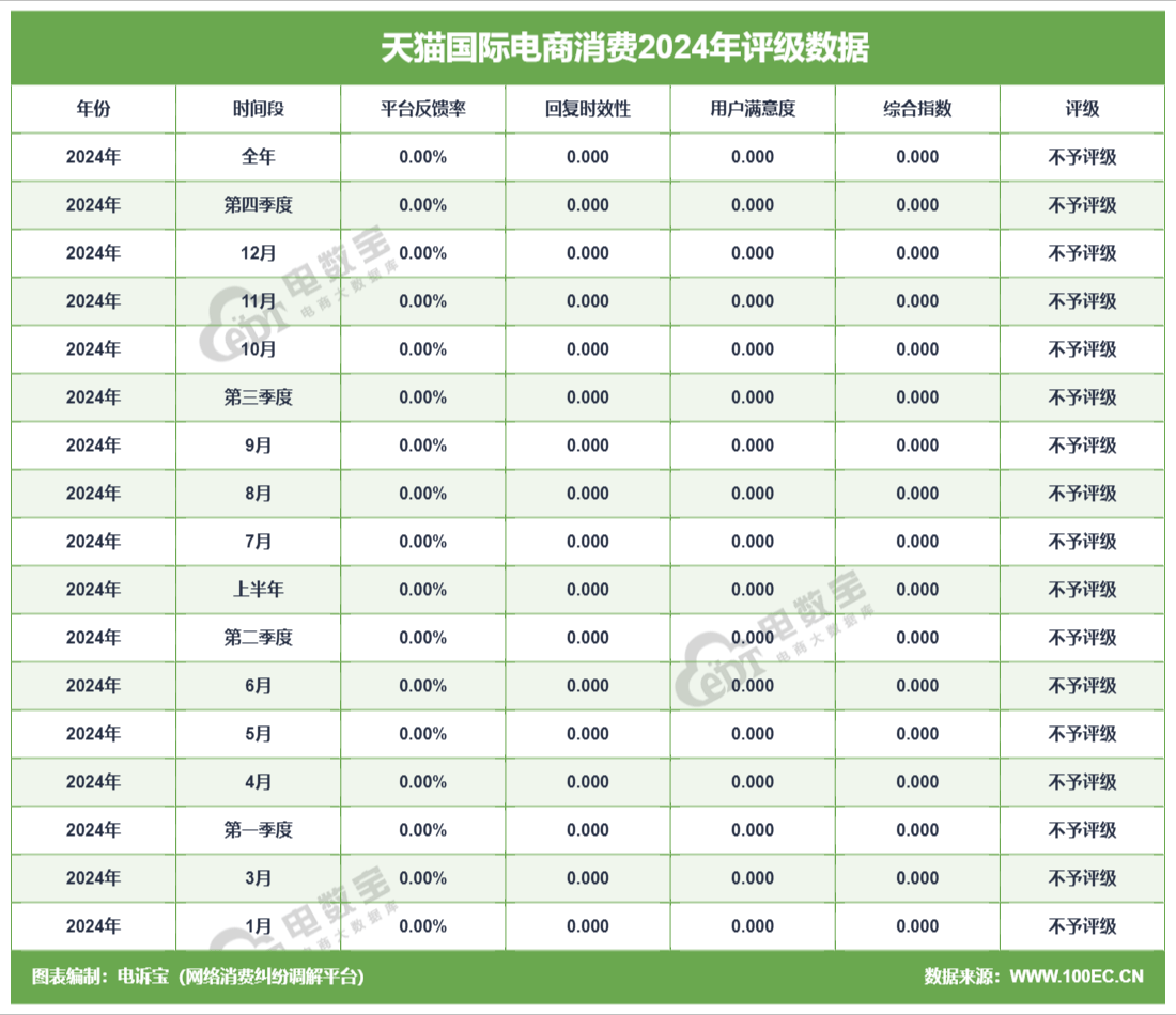 据“电数宝”监测数据显示,2024年“天猫国际”共获得17次消费评级,17次获“不予评级”评级,2024年整体消费评级为“不予评级”评级 。