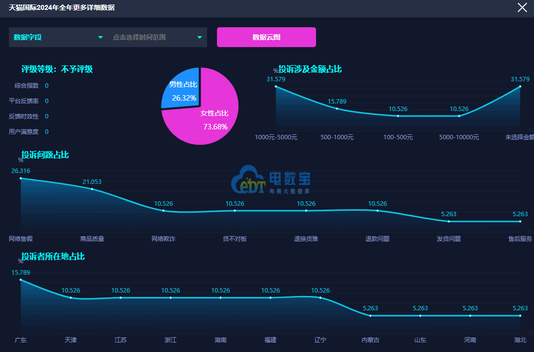 2024年,用户投诉“天猫国际”的问题类型主要集中于网络售假、商品质量、网络欺诈;“电诉宝”受理投诉用户聚集地区为广东省、天津市、江苏省、浙江省、湖南省、福建省、辽宁省、内蒙古、山东省、河南省、湖北省;其中,女性用户投诉比例为73.68%、男性用户投诉比例为26.32%;用户投诉“寺库”投诉金额分布于1000-5000元、500-1000元、10-500元以上、5000-10000元区间。