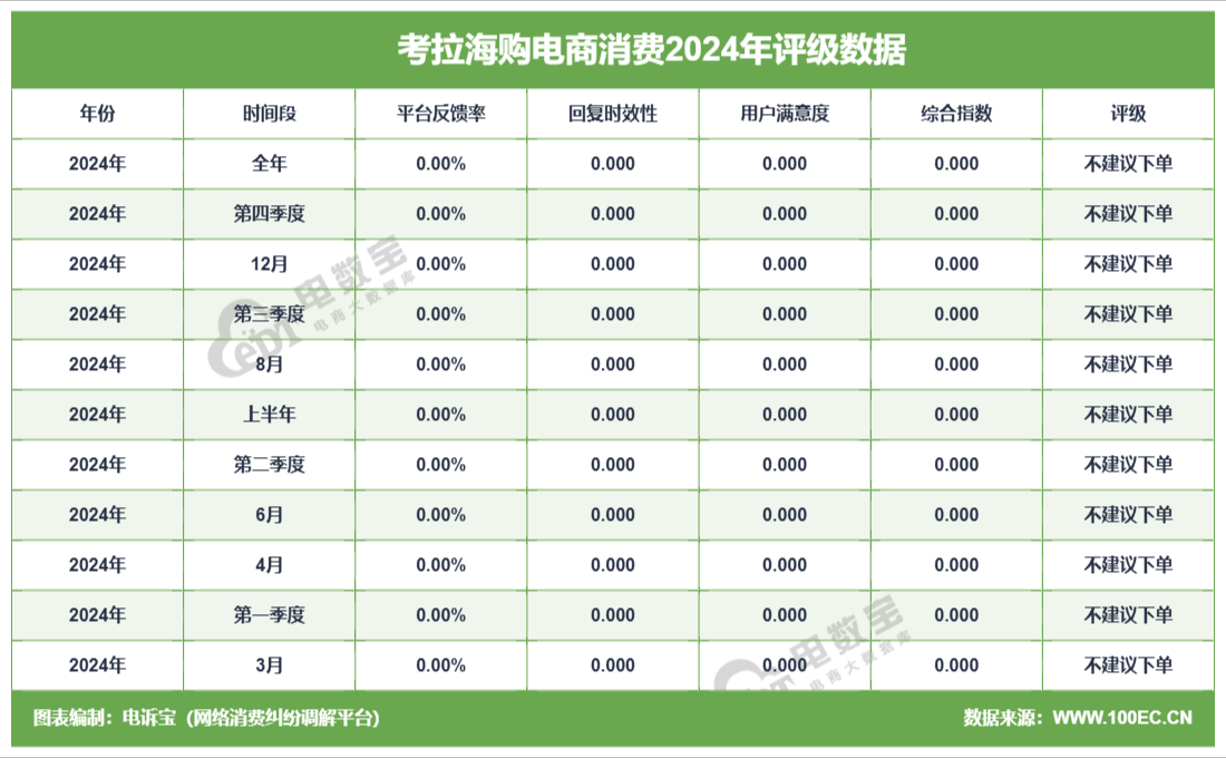 据“电数宝”监测数据显示,2024年“考拉海购”共获得11次消费评级,均为“不建议下单”,2024年整体消费评级为“不建议下单” 。