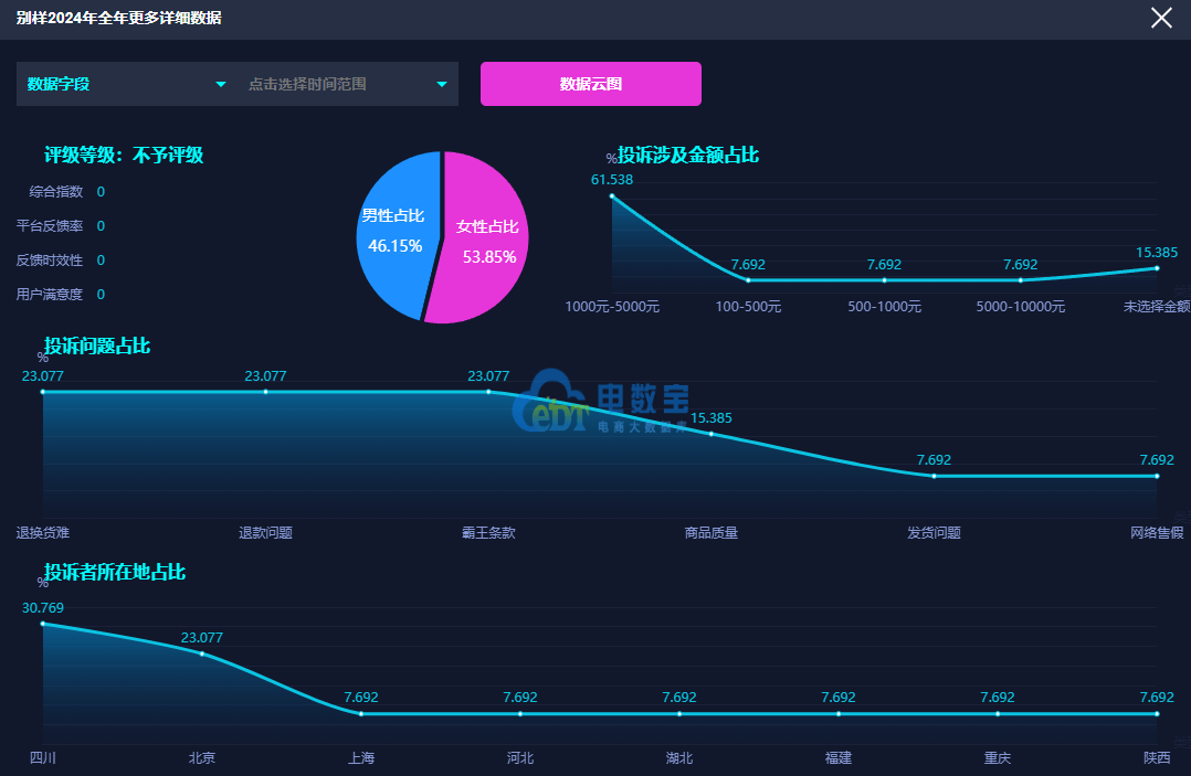 据“电数宝”显示,2024年全年,“别样”的问题类型主要集中于退换货难、退款问题、霸王条款、商品质量、发货问题、网络售假;“电诉宝”受理投诉用户聚集地区为四川省、北京市、上海市、河北省、湖北省、福建省、重庆市、陕西省;其中,女性用户投诉比例为53.85%,男性用户投诉比例为46.13%;用户投诉“别样”投诉金额分布于1000-5000元、100-500元、500-1000元、5000-10000元区间。