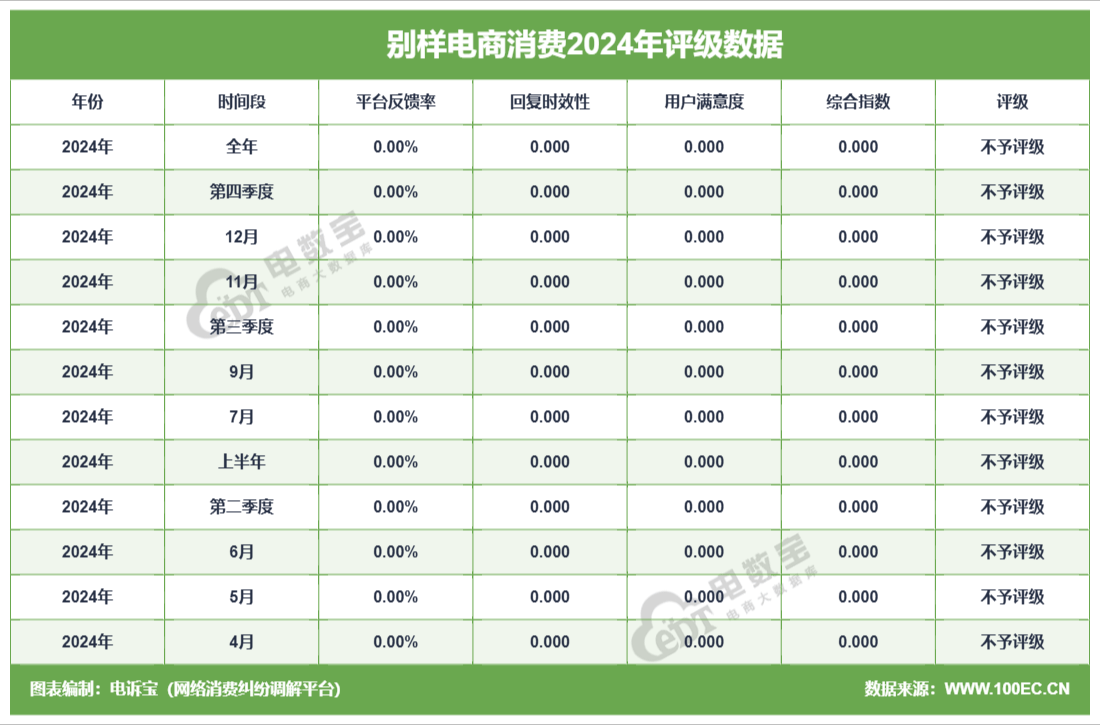 据“电数宝”监测数据显示,2024年“别样”共获得12次消费评级,均为“不予评级”,2024年整体消费评级为“不予评级” 。