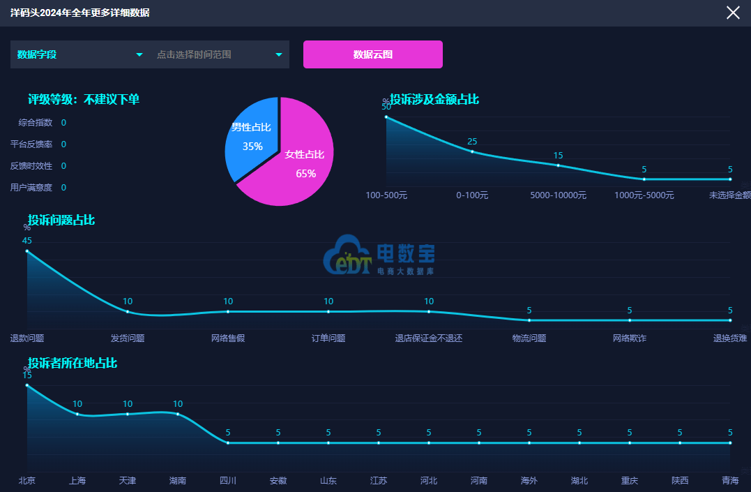 据“电数宝”显示,2024年全年,“洋码头”的问题类型主要集中于退款问题、发货问题、网络售假、订单问题、退店保证金不退还、物流问题、网络欺诈、退换货难;“电诉宝”受理投诉用户聚集地区为北京市、上海市、天津市、湖南省、四川省、安徽省、山东省、江苏省、河北省、河南省、海外、湖北省、重庆市、陕西省、青海省;其中,女性用户投诉比例为65%,男性用户投诉比例为35%;用户投诉“洋码头”投诉金额分布于100-500元、5000-10000元、1000-5000元区间。