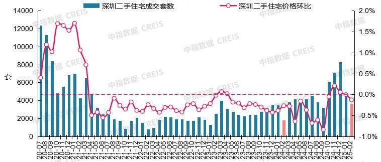 图:2020年7月至2025年2月深圳二手住宅成交套数及二手住宅价格环比走势
