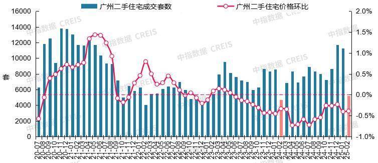 图:2020年7月至2025年2月广州二手住宅成交套数及二手住宅价格环比走势