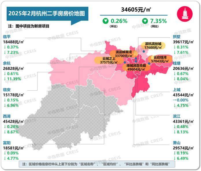 图:2025年2月杭州各市辖区二手住宅挂牌均价及环同比