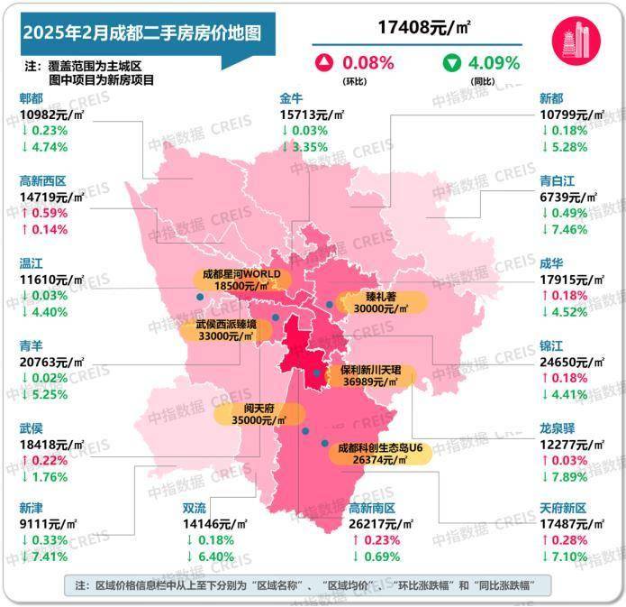 图:2025年2月成都各市辖区二手住宅挂牌均价及环同比