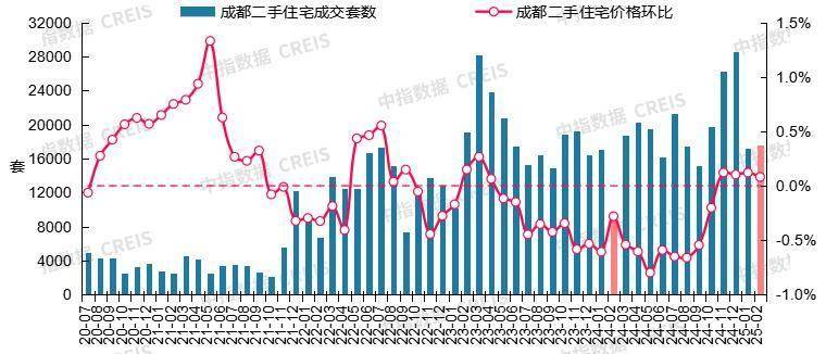 图:2020年7月至2025年2月成都二手住宅成交套数及二手住宅价格环比走势