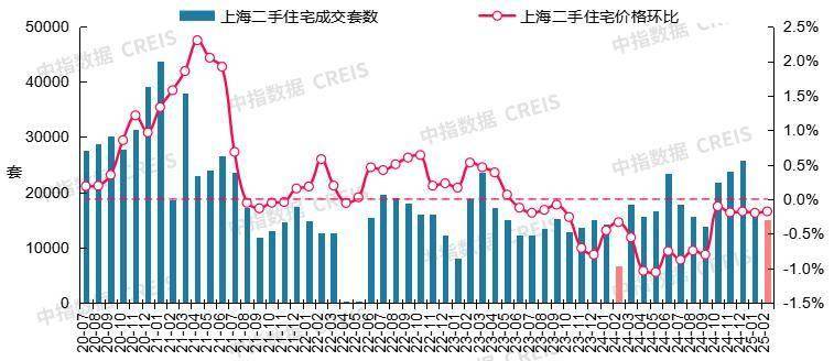 图:2020年7月至2025年2月上海二手住宅成交套数及二手住宅价格环比走势