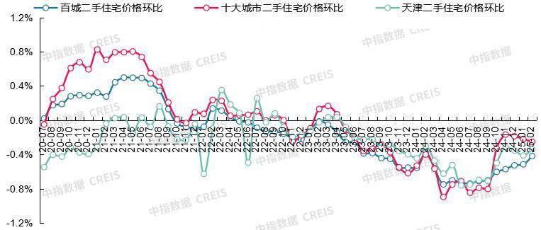 图:2020年7月至2025年2月百城、十大城市及天津二手住宅价格环比走势对比
