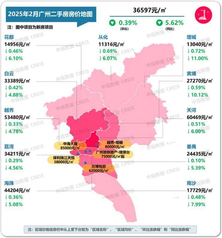 图:2025年2月广州各市辖区二手住宅挂牌均价及环同比