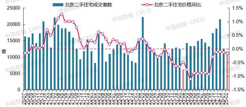 图:2020年7月至2025年2月北京二手住宅成交套数及二手住宅价格环比走势