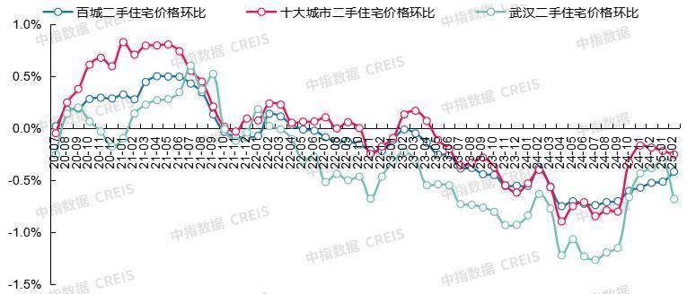 图:2020年7月至2025年2月百城、十大城市及武汉二手住宅价格环比走势对比