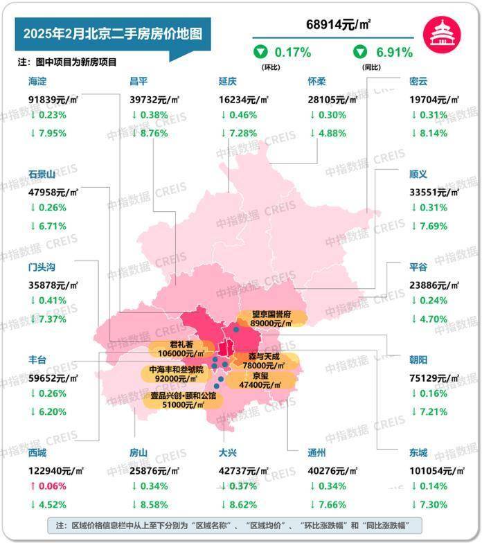 图:2025年2月北京各市辖区二手住宅挂牌均价及环同比