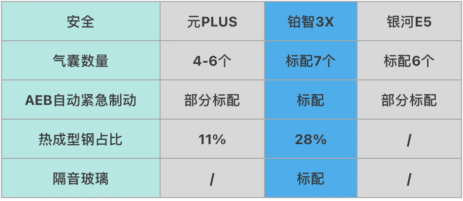 而元PLUS和银河E5在这方面确实不如铂智3X,安全气囊较少,AEB自动紧急制动系统也只是部分车型才配备,虽然在安全性和技术方面有一定的保障,但与丰田相比,还是有所差距。
