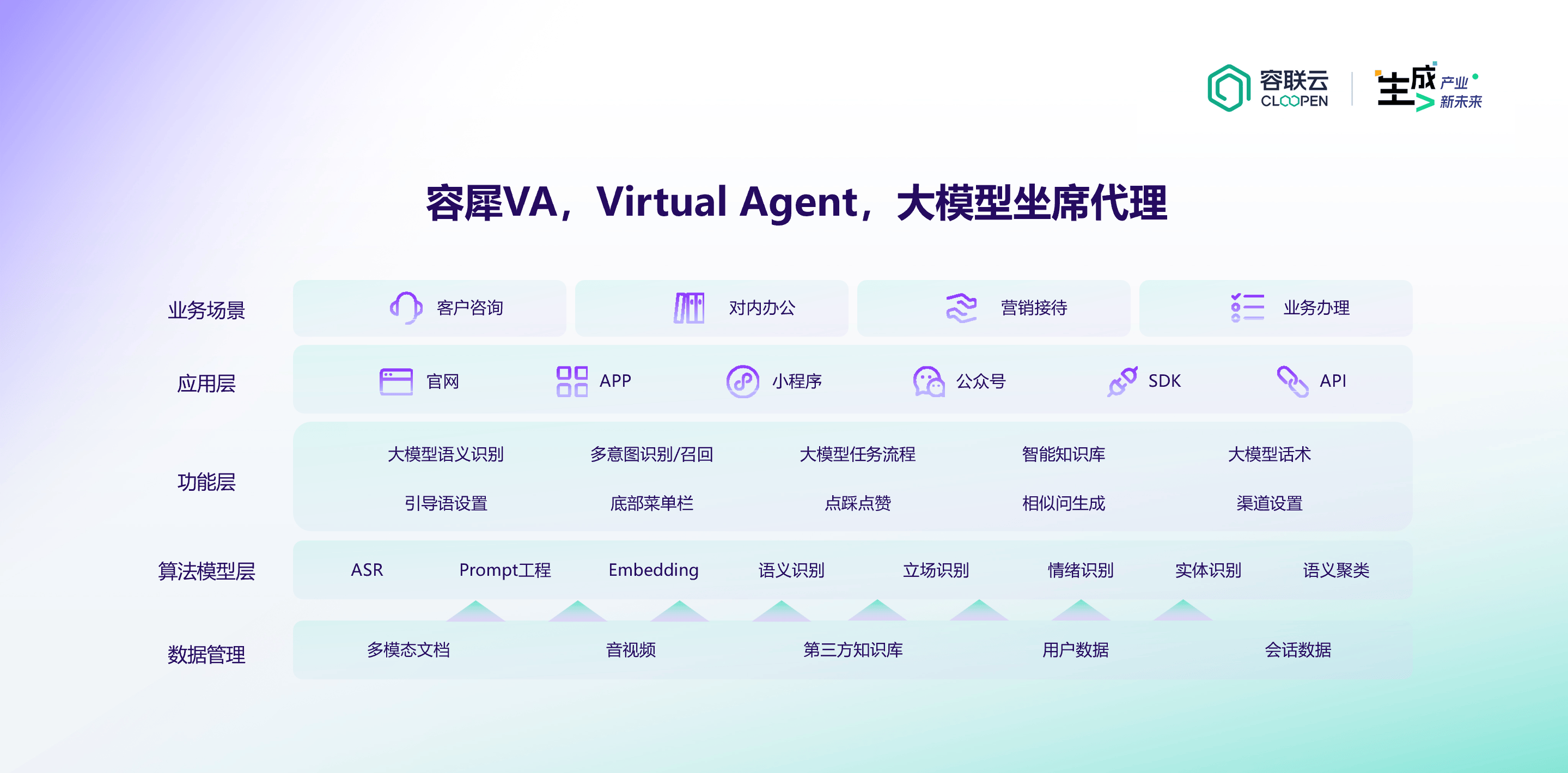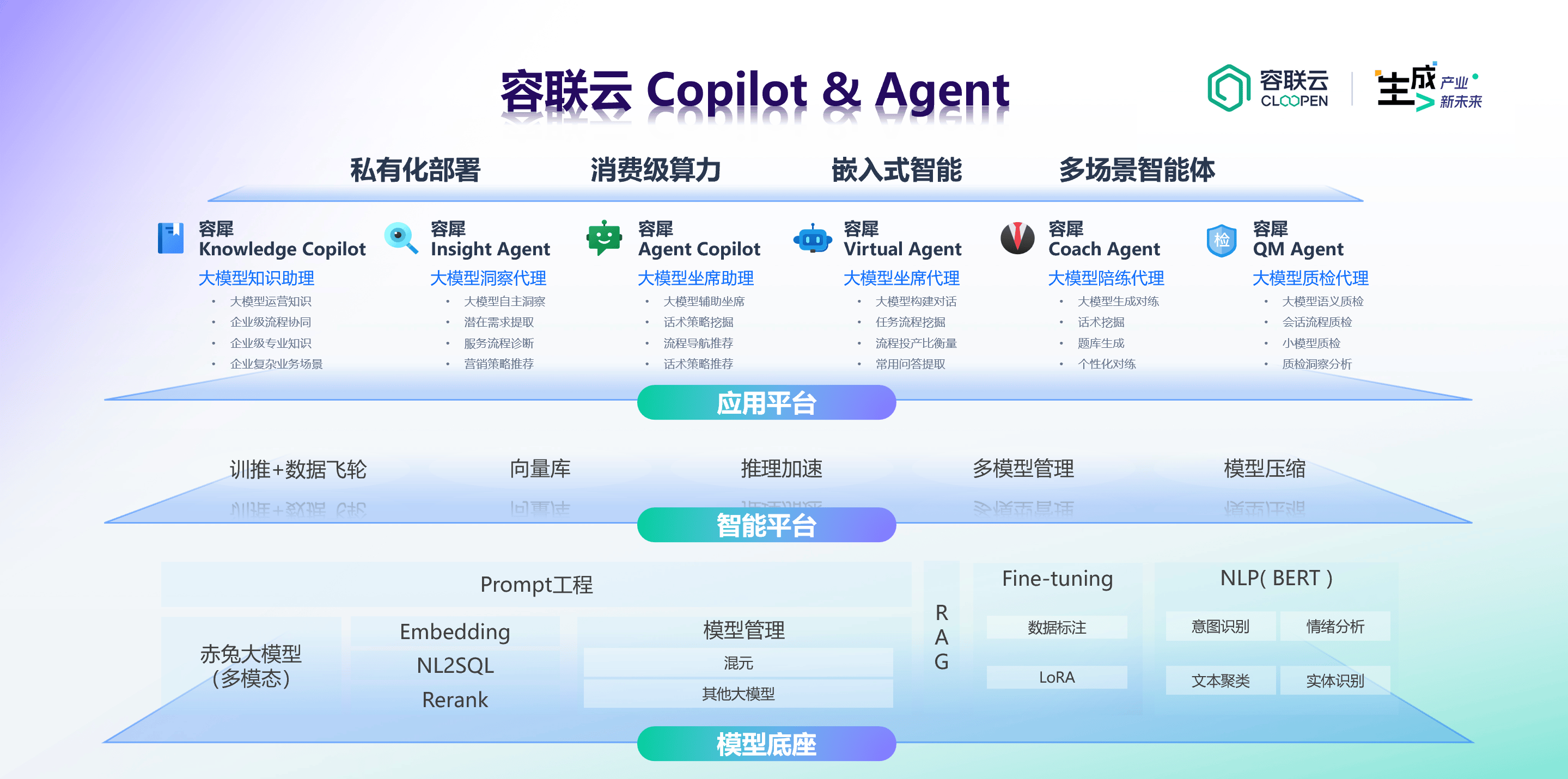 容联云的Copilot & Agent解决方案正是这一趋势的典范,以“行业化、场景化、价值化”为锚点,将前沿大模型技术与行业规则、业务逻辑深度耦合,构建覆盖客户服务、精准营销、合规管理、内部管理等全场景的解决方案,帮助企业实现效率跃迁。