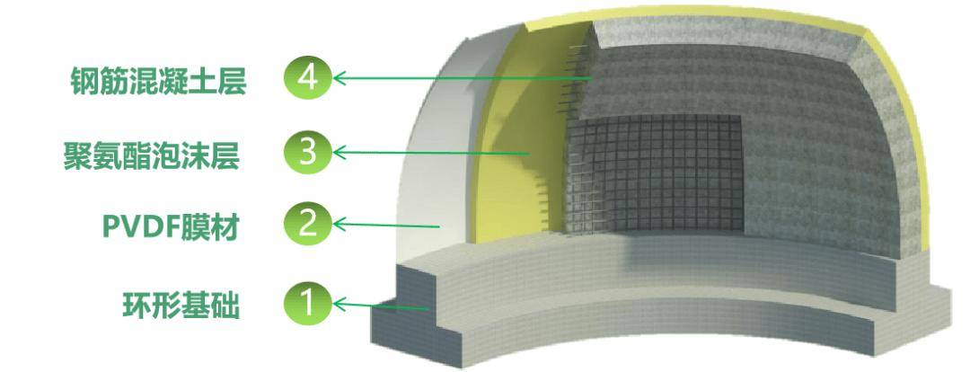 查询获悉,报道中的气膜粮仓由中煤建设集团六十八公司与中储粮成都储藏研究院有限公司共同研发设计,采用气膜 + 钢筋混凝土薄壳结构即气膜钢筋混凝土结构,从外向内分别为 PVDF 膜材、聚氨酯泡沫层、钢筋混凝土结构层。其储量较之前的试验性气膜粮仓增加了 1500 吨。与此仓同期施工的气膜粮仓共计五座,将于今年 11 月全面完成主体结构施工。