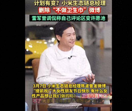 这条出来当时就引发讨论,说可惜小米不做卫生巾了,结果3月17日陈波删除了这条微博,马上引发大众议论,话题直接冲上热搜第一,很多人议论,为什么删了,是不是要做了?
