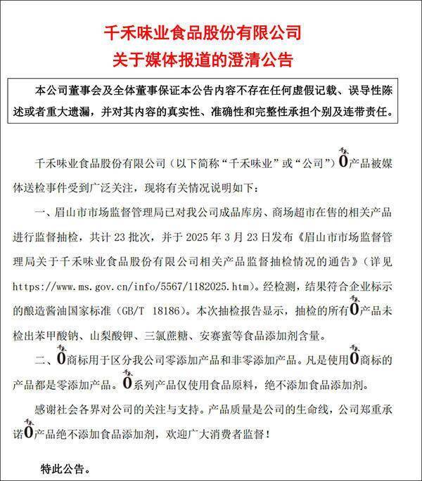 3月24日,千禾味业食品股份有限公司发布关于媒体报道的澄清公告。公告指出,“千禾0”商标用于区分该公司零添加产品和非零添加产品。凡是使用“千禾0”商标的产品都是零添加产品。“千禾0”系列产品仅使用食品原料,绝不添加食品添加剂。