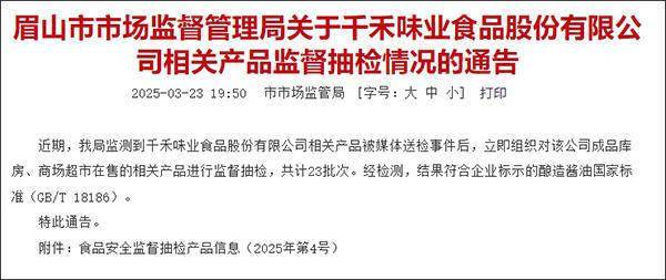 3月23日,眉山市市场监管局在四川省眉山市人民政府网站发布通告称,对该公司成品库房、商场超市在售共计23批次的相关产品进行监督抽检,结果符合企业标示的酿造酱油国家标准(GB/T 18186)。