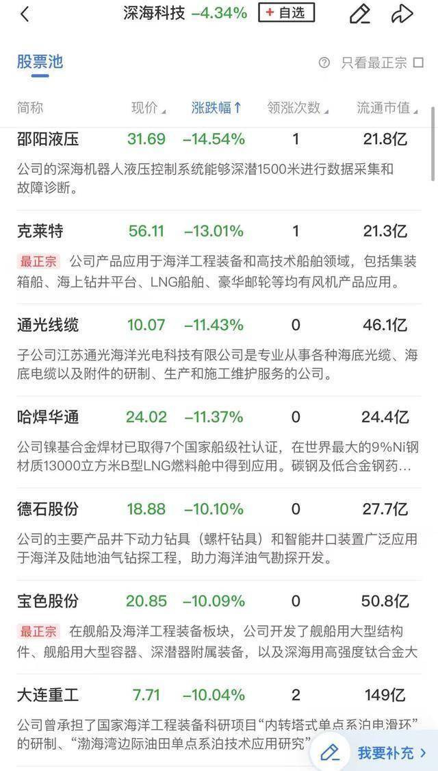 深海科技概念遭遇重挫,大连重工、神开股份、振华重工跌停,邵阳液压、克莱特、海兰信、深水海纳等个股跌超9%。