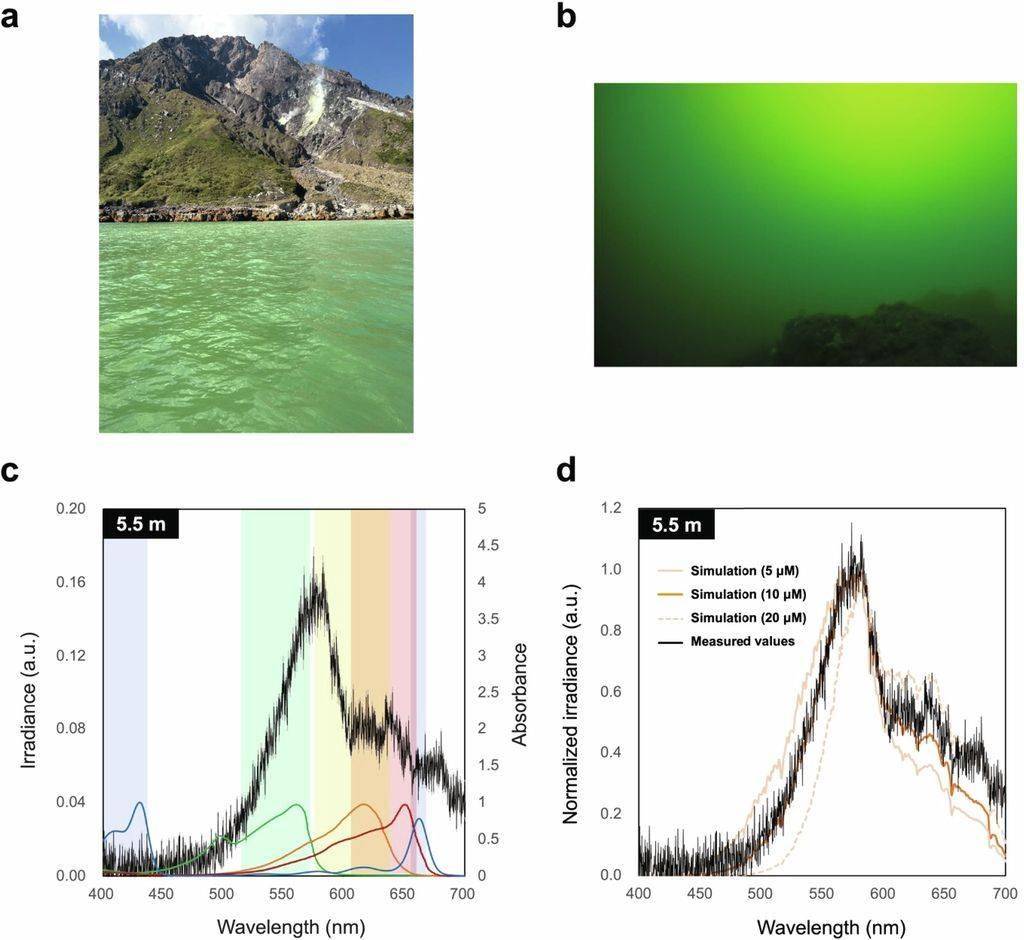 这些颗粒优先吸收蓝光和红光,导致水下绿光透射率最高,使海洋呈现绿色,科学团队在萨南群岛硫磺岛海域(2023 年实测)观察到类似现象,含氢氧化铁的水体明显泛绿光。