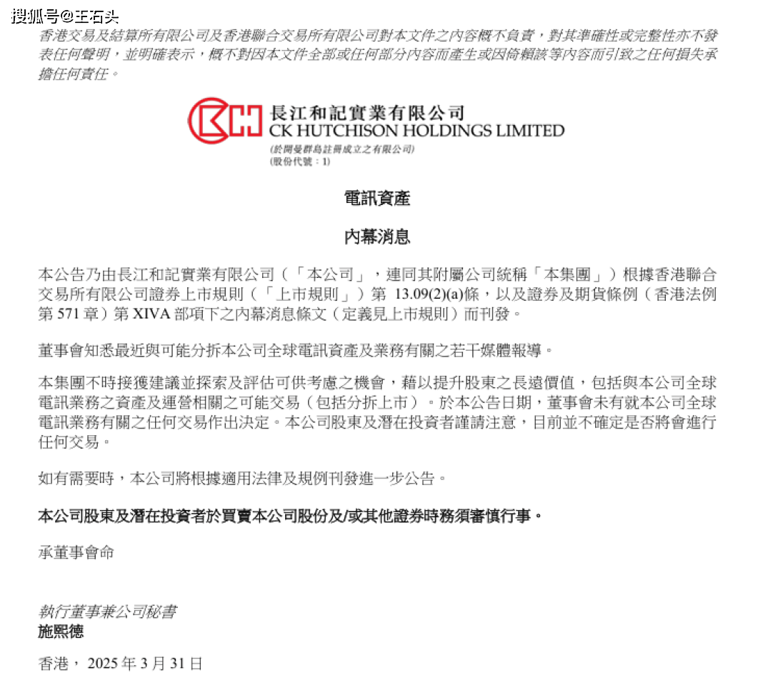 而在3月31日的公告中,长和集团更是明确表示,关于全球电讯业务的任何交易,董事会尚未作出决定。
