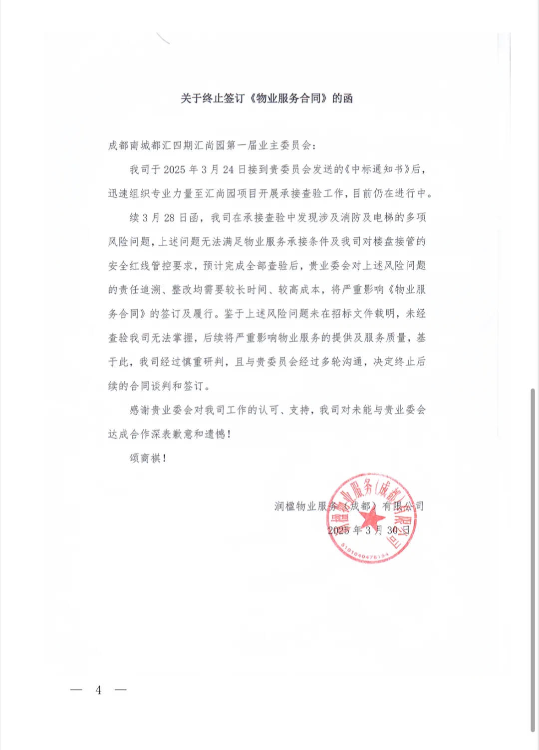 3月30日,润楹成都公司发函通知汇尚园业委会终止签订合同的决定,原因是“我司在承接查验中发现涉及消防及电梯的多项风险问题,上述问题无法满足物业服务承接条件及我司对楼盘接管的安全红线管控要求,预计完成全部查验后,业委会对上述风险问题的责任追溯、整改均需要较长时间、较高成本,将严重影响《物业服务合同》的签订及履行”。