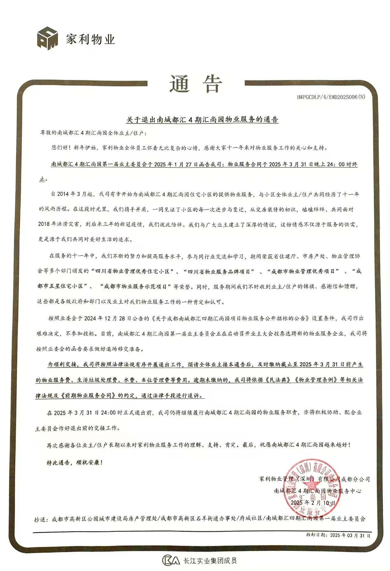 家利物业成都公司退场通告 图源:家利物业旗下公众号