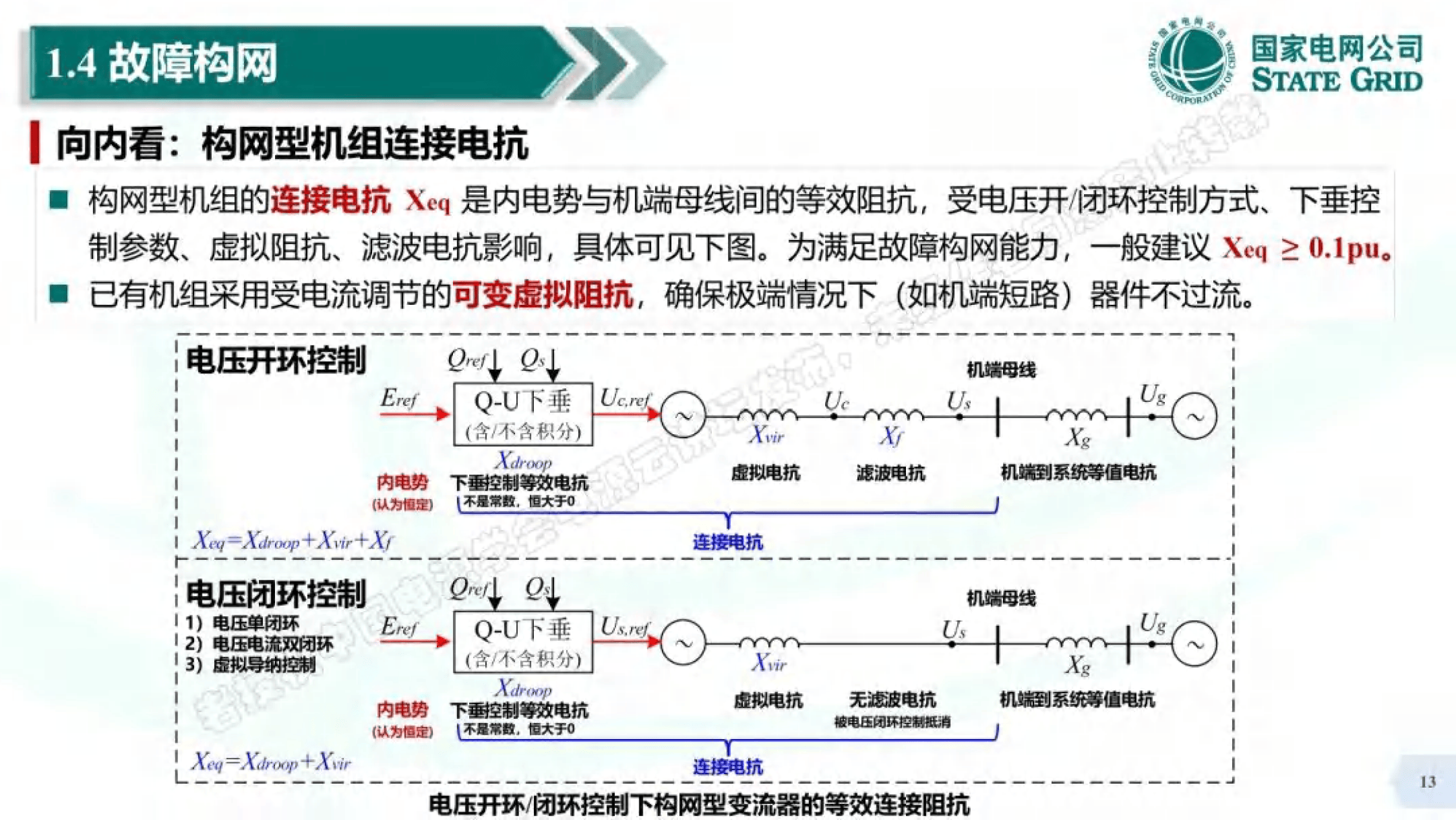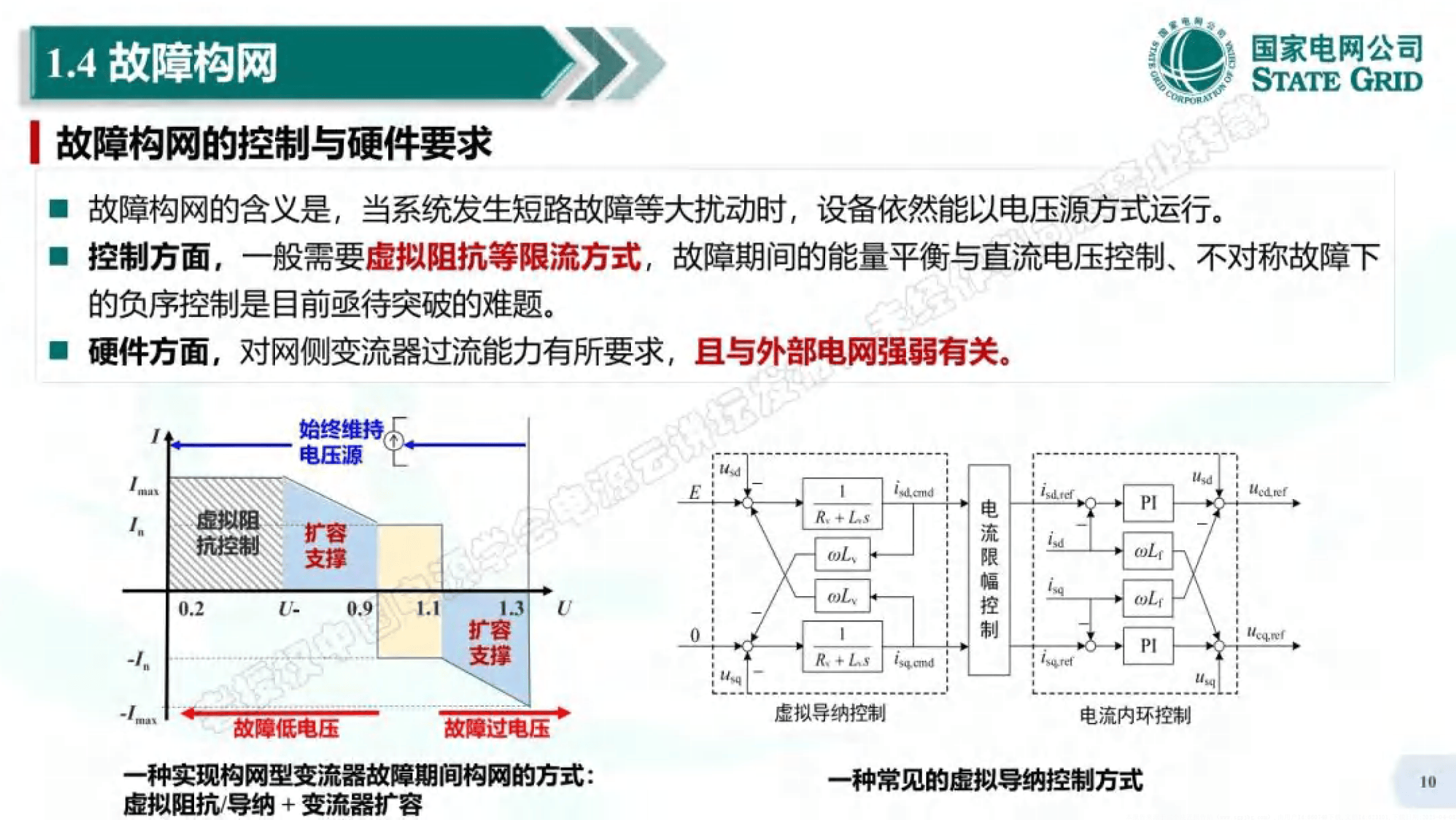 故障构网:系统故障时设备仍以电压源方式运行。控制上需虚拟阻抗等限流手段,硬件上网侧变流器过流能力与外部电网强弱有关。