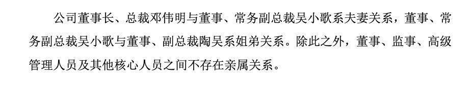 目前,邓伟明担任公司执行董事、董事长兼总裁,邓伟明儿子邓竞担任执行董事,吴小歌弟弟陶吴担任执行董事兼资深副总裁。