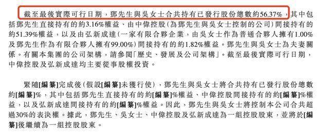 截至最后实际可行日期,邓伟明与吴小歌合共持有已发行股份总数约56.37%,其中包括邓伟明直接持有的约3.16%权益、由中伟控股(为邓伟明与吴小歌控制的公司)间接持有的约51.39%权益,以及由弘新成达(一家有限合伙企业,由吴小歌作为普通合伙人拥有1.00%及邓伟明作为有限合伙人拥有99.00%)间接持有的约1.82%权益。邓伟明与吴小歌为夫妻关系。
