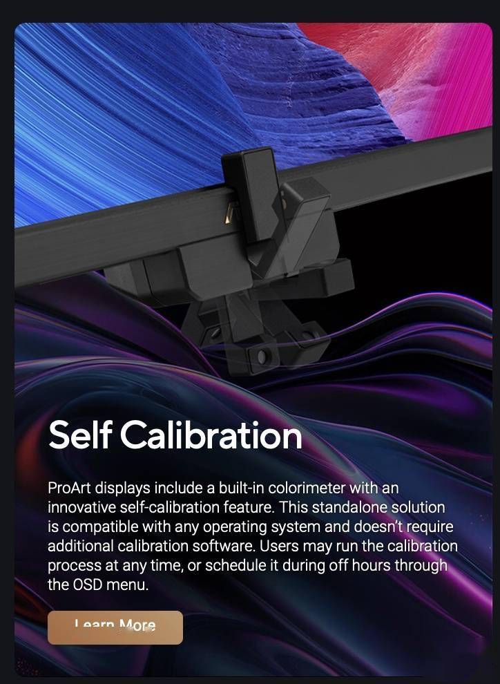 同时,该款显示器还采用内置校色仪设计,该校色仪为电动伸缩设计,在需要校色时才会自动伸出,且该功能为硬件功能,不需要安装软件,与任何操作系统都兼容;同时校色功能可在 OSD 菜单中进行定时预约,设定时间自动进行校色。