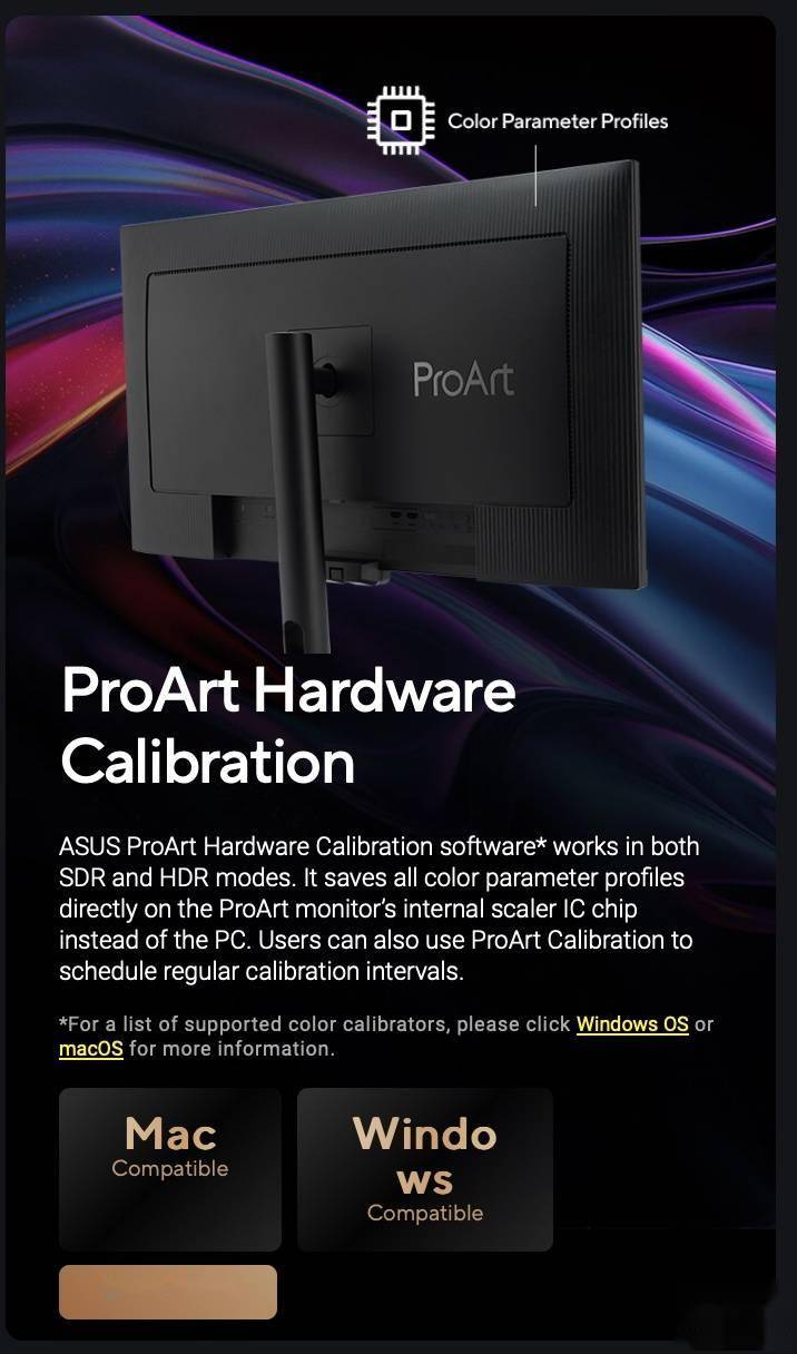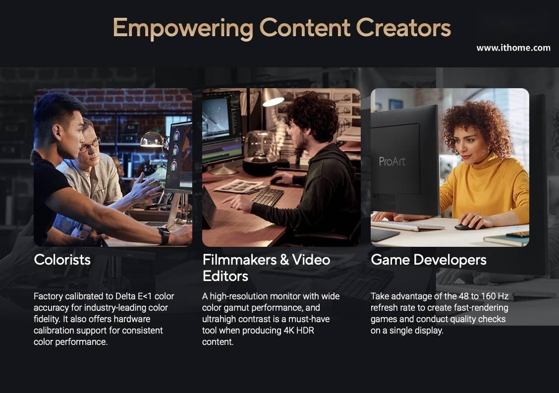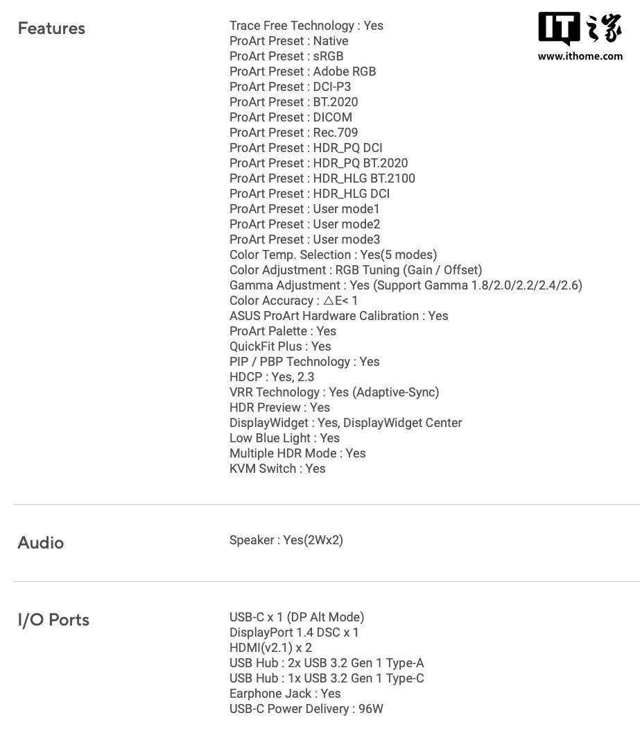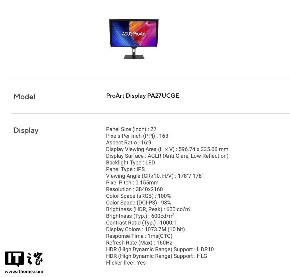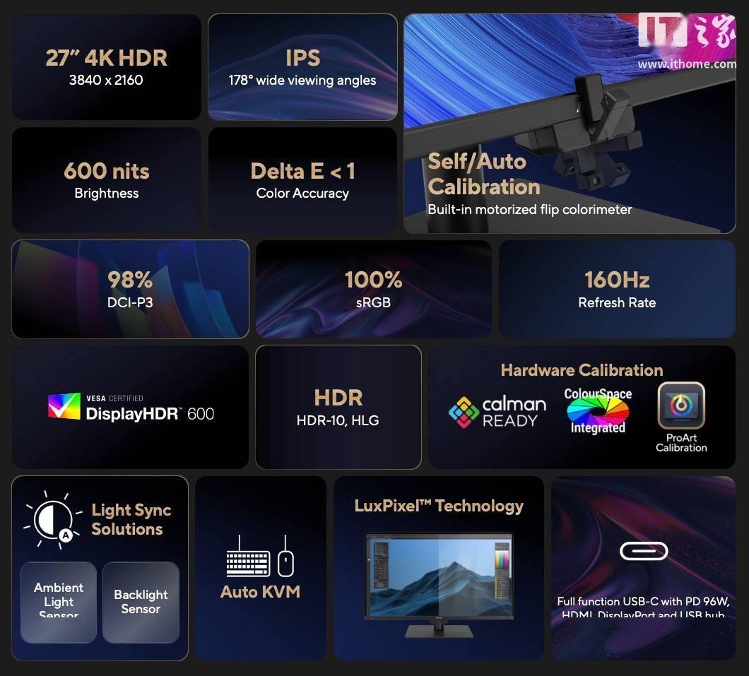 根据华硕官方所述,该款显示器为专业用户设计,采用 4K 分辨率面板,覆盖 98% PCI-P3 和 100% sRGB 色域,Delta E<1;峰值亮度 600 尼特,刷新率最高 160Hz。