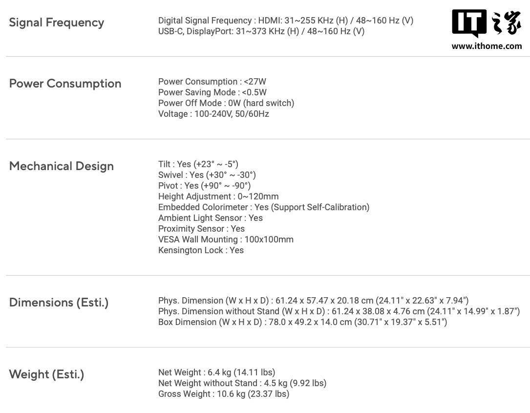 在 IO 方面,该显示器有两个 HDMI 2.1 接口、一个 DP 1.4 接口、一个 USB-C 接口(DP Alt 模式)、一个下行 USB-C 接口、两个下行 USB-A 接口及 3.5mm 耳机接口。USB-C 接口最大支持 96W 反向供电,可兼容各种笔记本电脑。