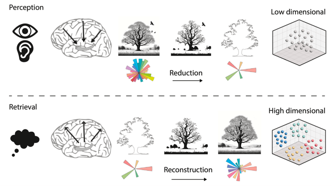 ▷图4:记忆编码与提取过程中的神经表征维度变化假说。在感知编码阶段,外界复杂信息(如包含鸟类等多细节的树木场景)通过海马等联合区进行降维压缩,转化为低维表征(简化的树木轮廓)以节省存储空间,但会丢失部分细节。提取时,低维编码通过与皮层交互重建记忆,但因初始信息损失无法完全还原,导致回忆内容出现失真(细节减少或变形)
