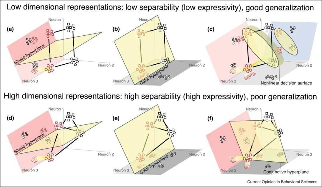 ▷图3 通过三神经元模型对比低维与高维神经表征的计算特性。低维表征(a-c)中,四种刺激的响应被压缩到二维平面,虽可线性解码形状或颜色特征(a/b),但无法线性区分特征组合(如红方块需非线性解码)。高维表征(d-f)中,响应占据三维空间,不仅能线性分离单一特征(d/e),还能直接解码特征组合(f)。表明高维表征通过增加非线性混合选择性神经元的多样性,显著提升了线性可解性,使更多复杂分类成为可能。图源:[3]
