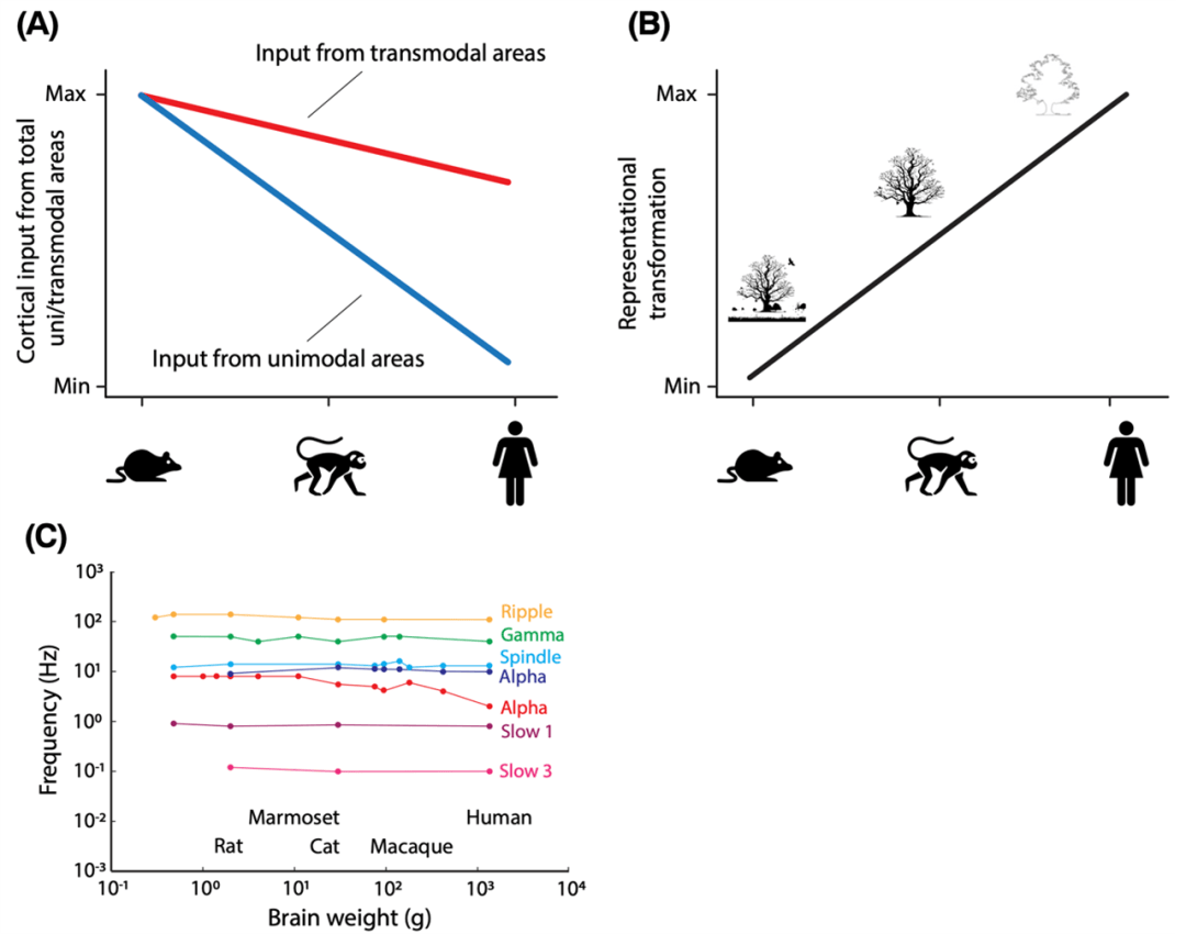 (A)跨物种的皮质-海马连接性差异:展示了从大鼠到人类的进化过程中,海马系统与感觉皮层和跨模式皮质区域的连接性变化,表明人类海马系统更多地依赖高度抽象的跨模式输入。