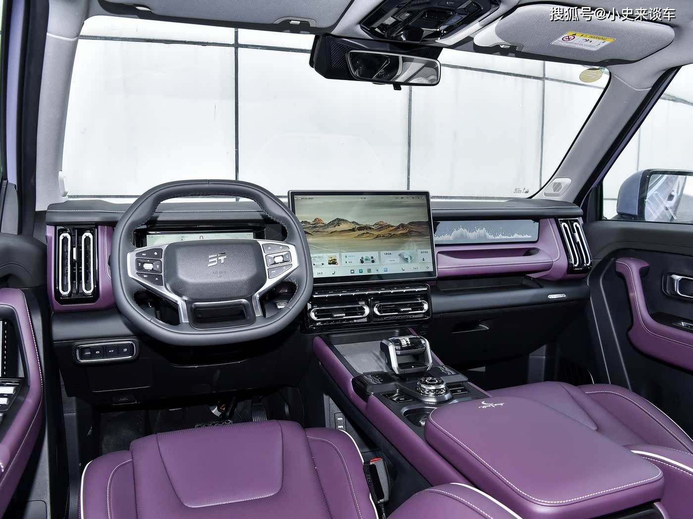 进入车内,新车的设计理念是科技与实用并存,虽然外观硬朗,但山海T1的内饰并未牺牲舒适性和科技感,整体布局更偏向现代化风格。中控台有着大尺寸悬浮屏,预计配备15.6英寸中控屏,内置高通8155芯片,支持智能语音、车联网、OTA升级等功能。全液晶仪表盘为10.25英寸显示屏,可显示越野信息、混动系统状态等。值得一提的是新车依旧保留了电子挡把+实体按键方便越野时快速操作。材质方面,新车的中控台和门板采用大量软性材质,搭配铝合金饰条,提升质感。座椅可选装麂皮材质或防水面料,方便户外使用。同时新车提供电子手刹、驾驶模式调节、氛围灯、后排空调出风口/中央扶手、全景天窗、全景影像、电动尾门、前排座椅电动调节以及后排座椅放倒等配置。