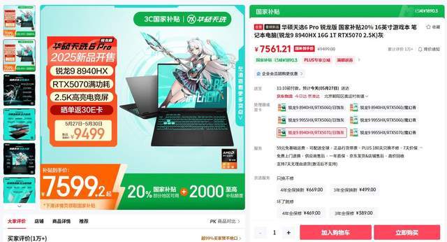 如果购机预算在7000价位段,那么华硕天选6 Pro锐龙版的RTX 5070机型就可以关注一下了。同样是配备了AMD锐龙9 8940HX处理器、16GB内存、1TB固态硬盘,RTX 5070版的华硕天选6 Pro锐龙版一系列优惠叠加下来,笔者实测到手价为7561.21元,国补政策带来的高性价比总是给人惊喜。